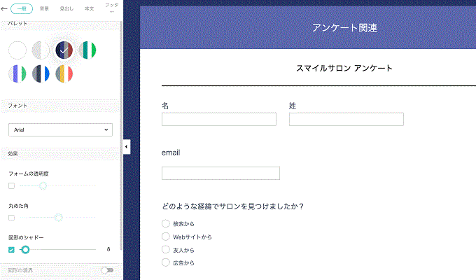 アンケートフォームの色使いやデザインは、テンプレート化されています。アンケートイメージに合ったデザインを選択するだけで、スタイリッシュなフォームを作成することができます。